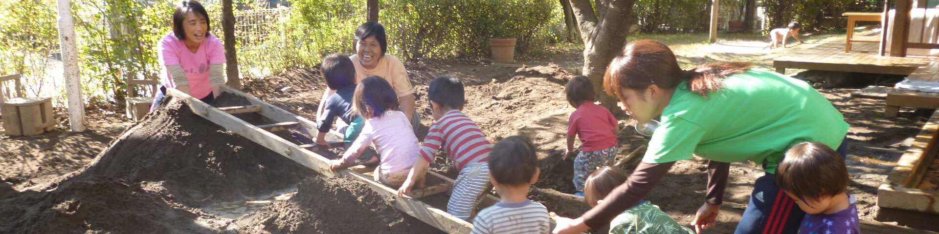 園舎は子どもたちが一日心地よくすごせるよう、木をふんだんに使っています。八角形のホールの屋根がシンボル。門を入るとすぐに園庭があります。遊具、椅子、テーブルも木製です。園舎全体に広がる檜の床を、素足で踏みしめて一年中を過ごします。自然の素材(水・砂・泥)で心ゆくまで遊び呆けられる保育園です。